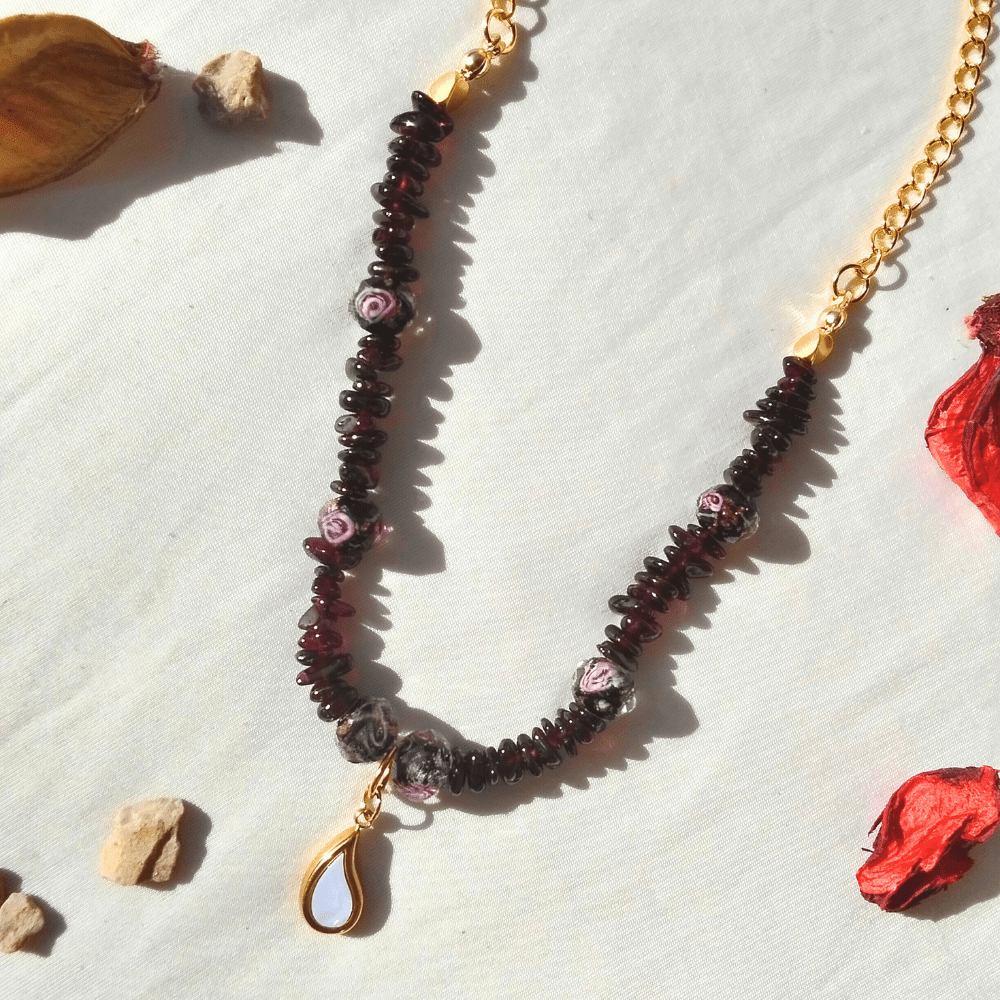 تتوسط اللؤلؤة لؤلؤة مياه عذبة محاطة بأهلة معدنية، لتكون بمثابة نقطة جذب مضيئة. يتميز العقد بخرز من الزوسيت الياقوتي الطبيعي، يعرض مزيجًا فريدًا من درجات الأخضر الترابي والأرجواني الداكن، يتناوب مع فواصل صغيرة من الكوارتز لإضفاء لمسة نهائية رقيقة. توازن فريد بين العناصر الطبيعية والتفاصيل الرمزية.