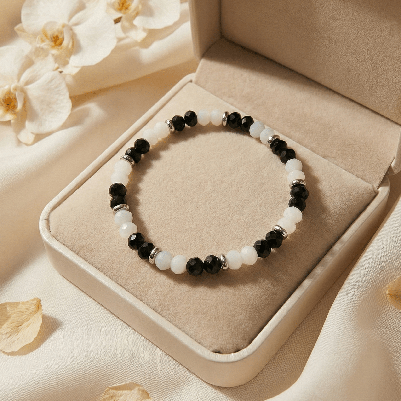 This piece features faceted Black Onyx and White Agate beads, separated by polished silver spacers. The alternating pattern creates a striking visual rhythm on a durable cord for comfort and ease.