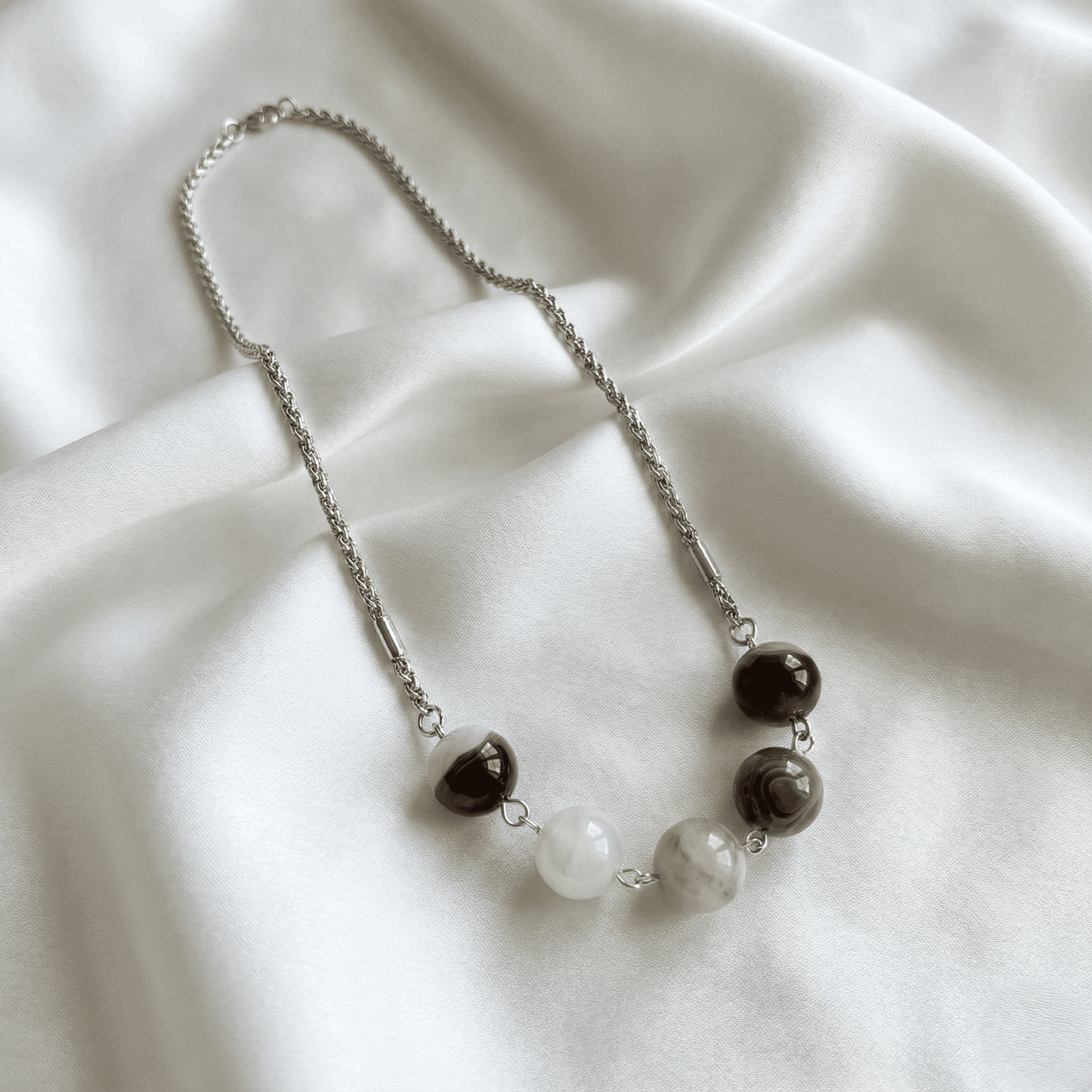 A refined necklace featuring a curated row of five polished agate beads, showcasing a seamless transition from deep, banded earth tones to soft, milky white. Suspended on a textured silver chain, the design embodies the perfect balance between light and shadow, strength and softness.